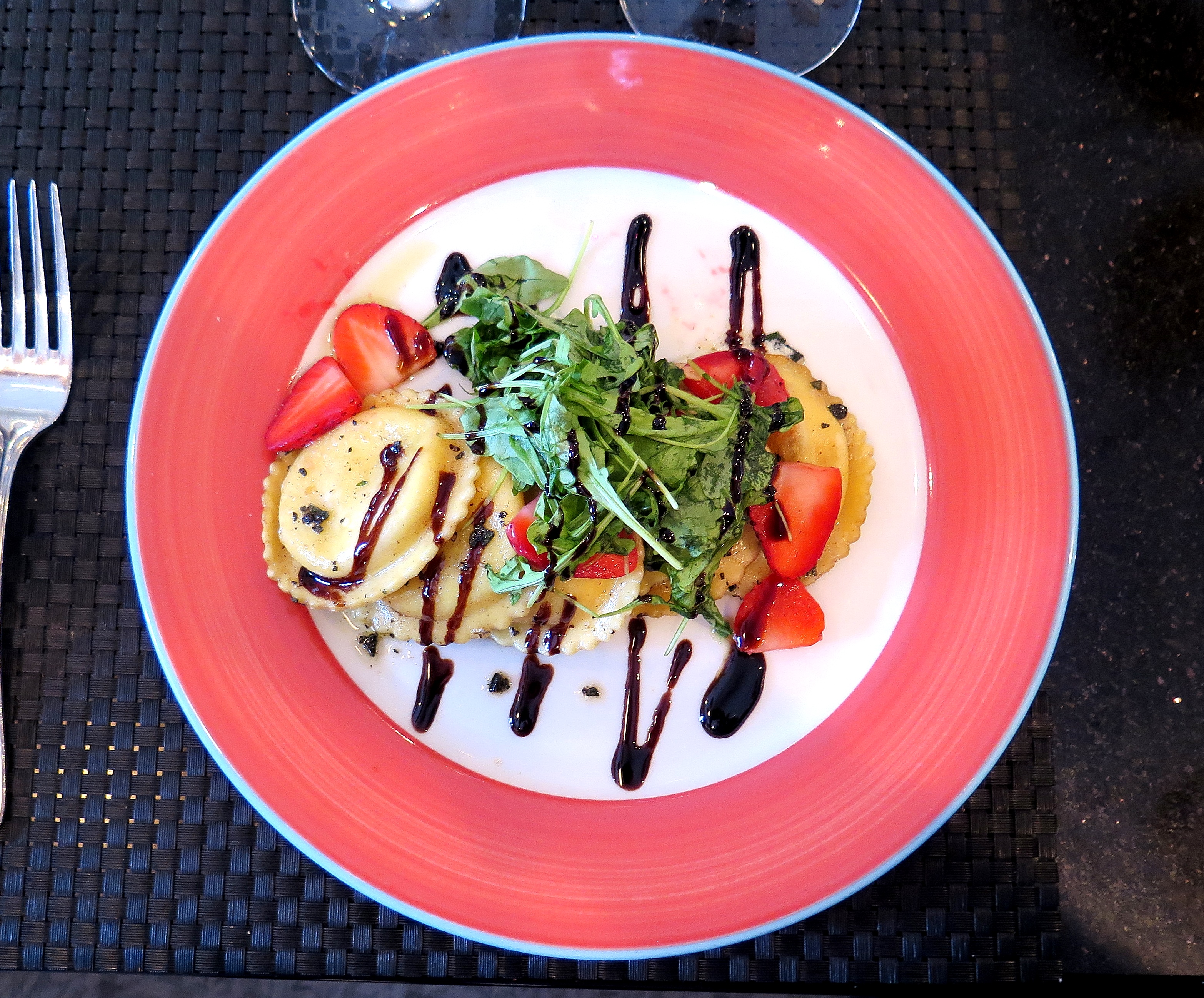 Sage Brown Butter Cheese Ravioli with Strawberries Arugula Balsamic Reduction
